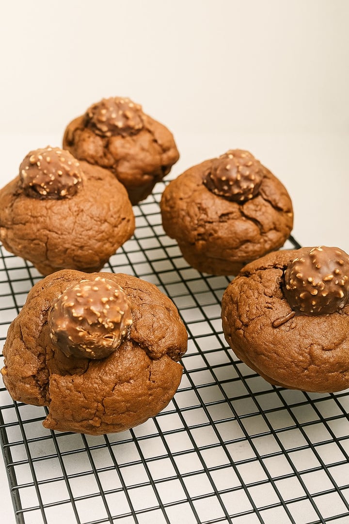 Masa de chocolate con pequeños trozos de nuez, rellena de crema de avellana y coronada con un ferrero rocher.